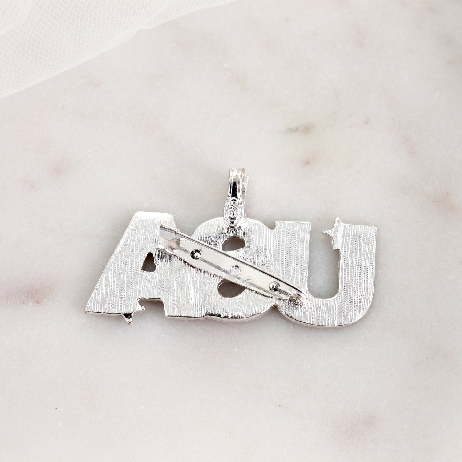 Silver tone magnetic clasp pin/pendant featuring a red, white, and blue “USA” done in crystal and glitter enamel. Pendant measures approximately 2.5” in width.