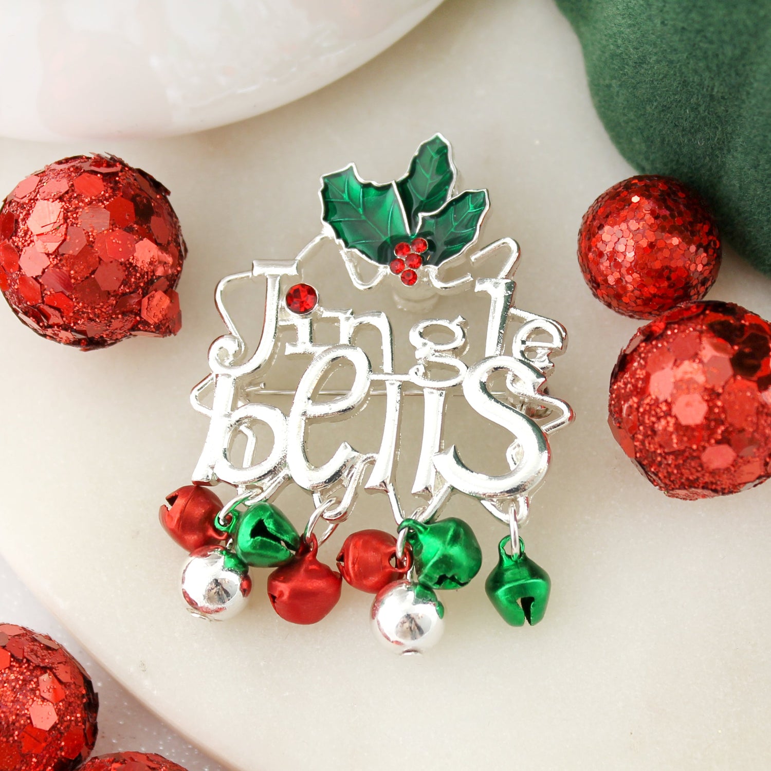 Silver tone magnetic clasp pin/pendant featuring the words “Jingle Bells” with enamel, crystal, and dangling jingle bell accents. Pin/pendant measures approximately 2” in height, including the dangling jingle bells. Makes a soft jingle sound...the perfect way to get into the Christmas spirit!