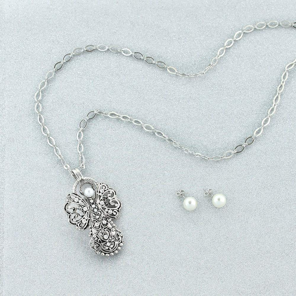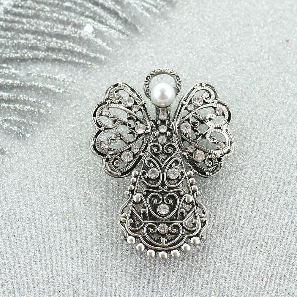 Silver tone magnetic clasp pendant featuring a filigree angel design with crystal and imitation pearl accents.