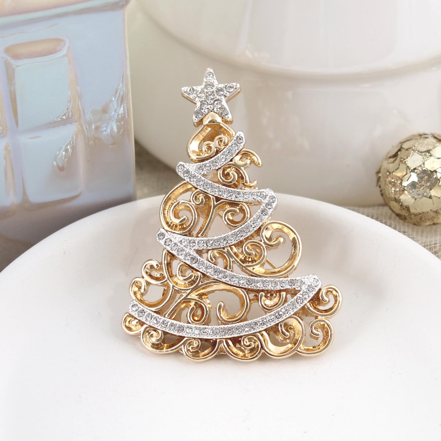 Gold tone magnetic clasp pin/pendant featuring a filigree style Christmas tree with silver tone and crystal accents. Pin/pendant measures about 2.25” in height.