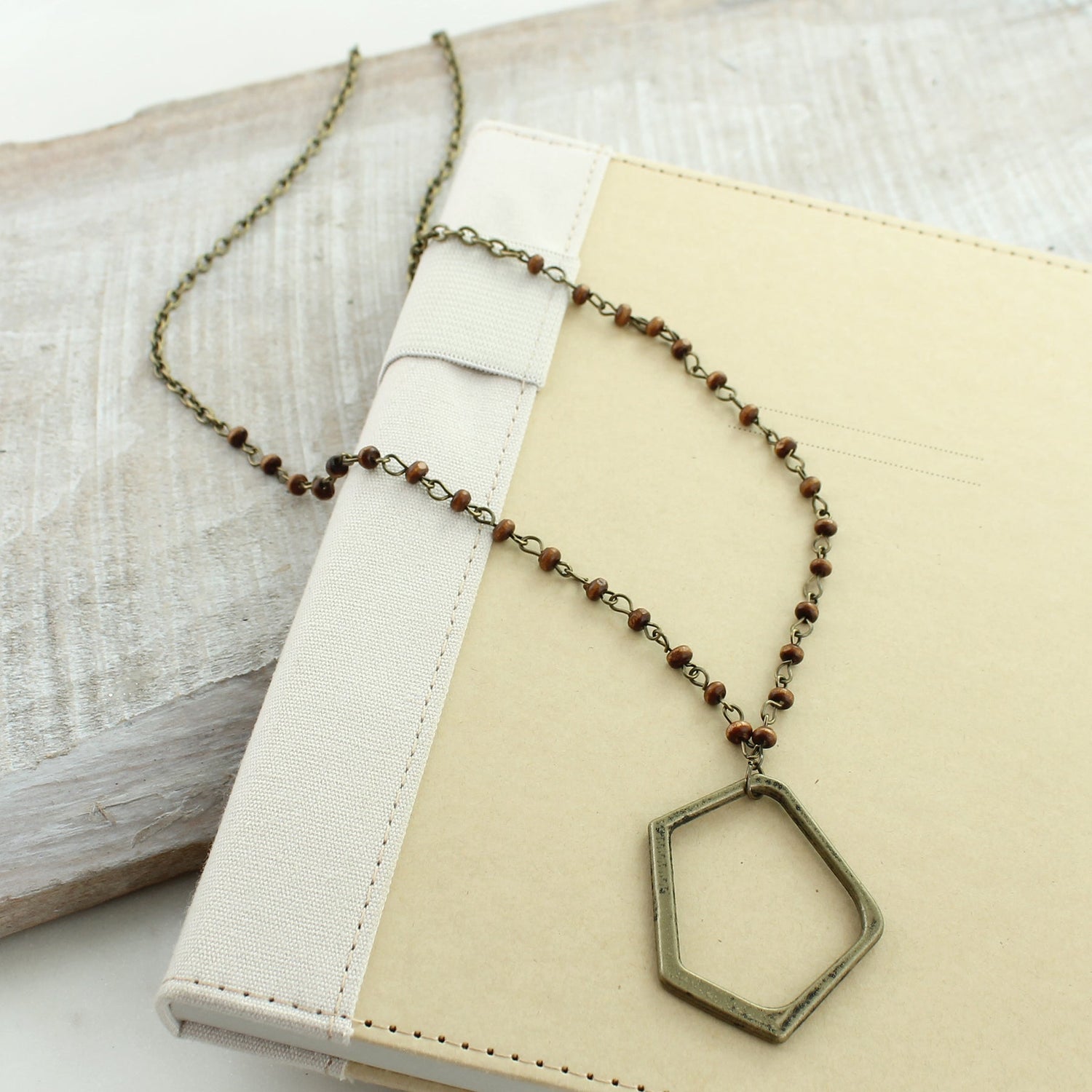 34” wood bead and vintage tone necklace with a vintage tone pentagon shaped pendant.
