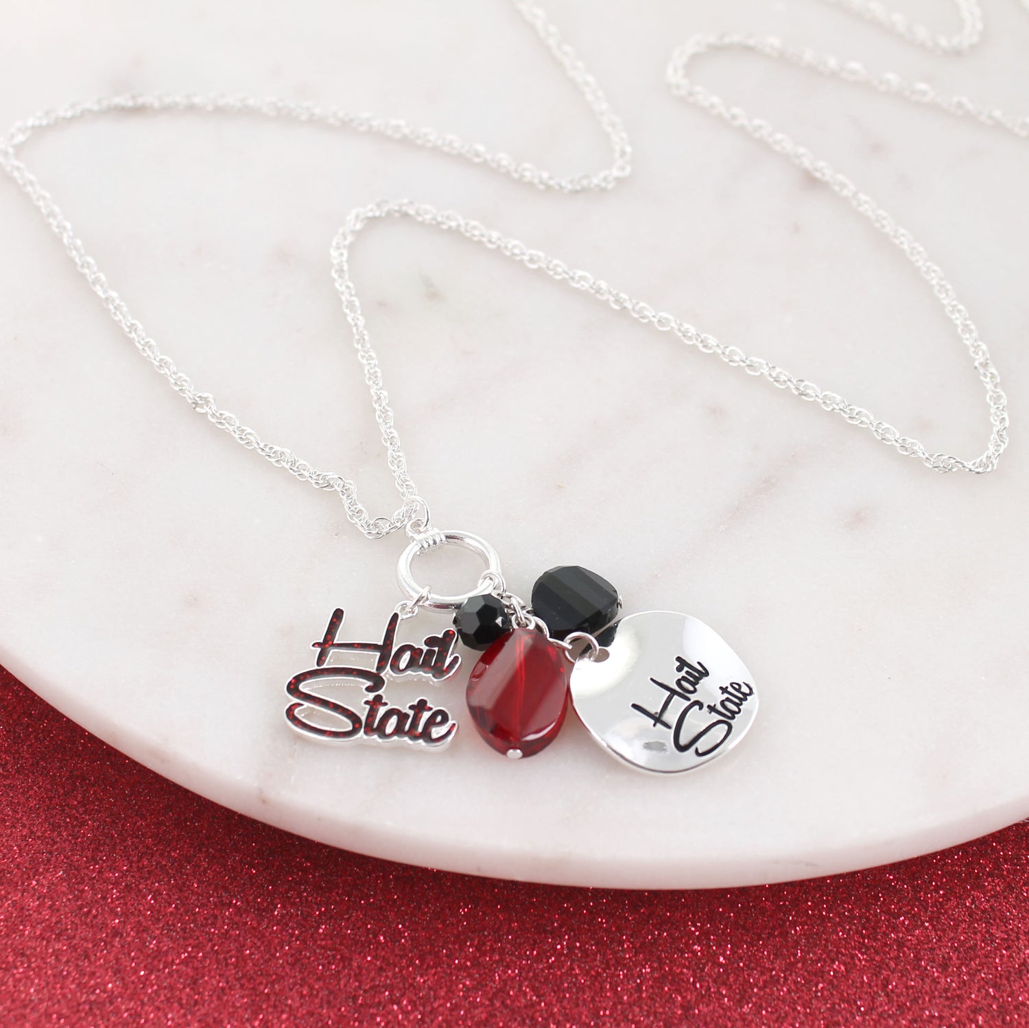 This charm cluster necklace is the ultimate 2-in-1 piece! It includes a toggle clasp for a short 18" look, or remove the toggle to wear as a 36" long necklace. Features maroon and black faceted beads, a silver stamped “Hail State” logo disc, and a “Hail State" charm in maroon glitter enamel—all on a silver tone chain. Flexible styling, perfect for every Bulldog fan!