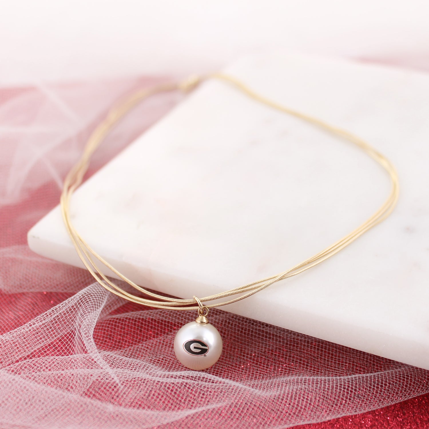 This stylish necklace features a triple-layered gold chain design with an oversized 14mm imitation pearl pendant accented by the Georgia “G” logo. The layered chain look adds a touch of glam while staying lightweight and wearable. Pairs perfectly with our pearl logo hoop earrings.