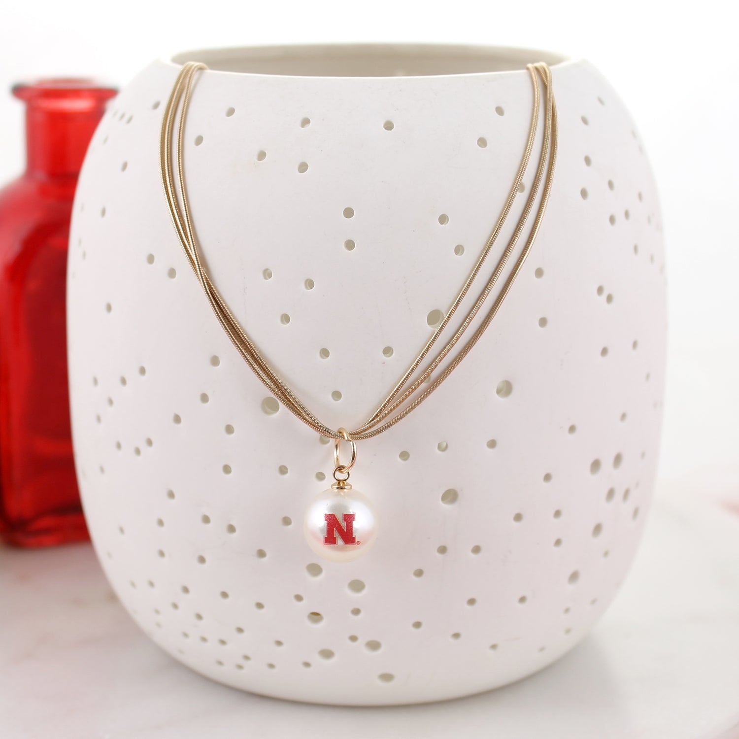 This stylish necklace features a triple-layered gold chain design with an oversized 14mm imitation pearl pendant accented by the Nebraska “N” logo. The layered chain look adds a touch of glam while staying lightweight and wearable. Pairs perfectly with our pearl logo hoop earrings.