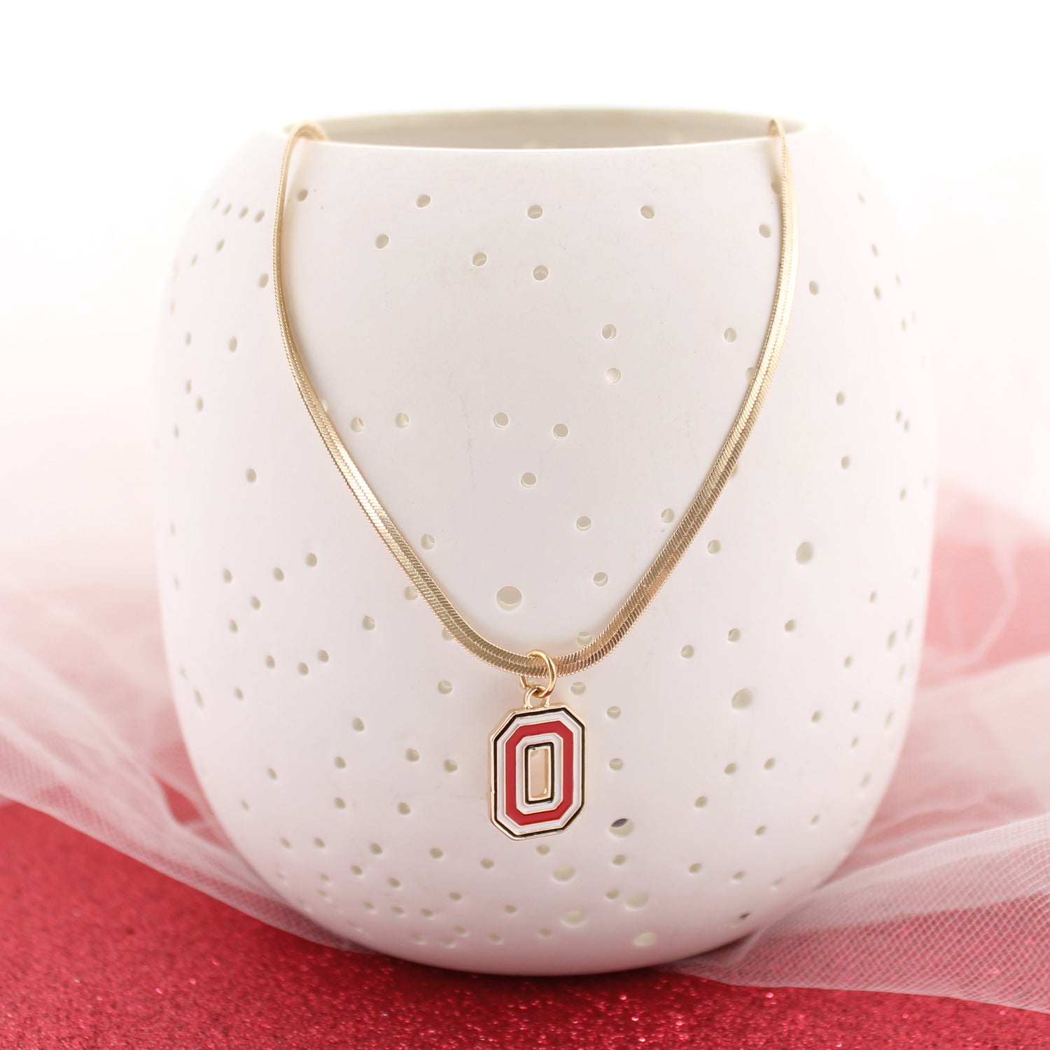 This shiny gold herringbone chain necklace adds a smooth finish to any look and features a sleek Ohio State Block O logo enamel charm. Coordinates perfectly with our shiny gold huggie hoop earrings and stretch bracelet.