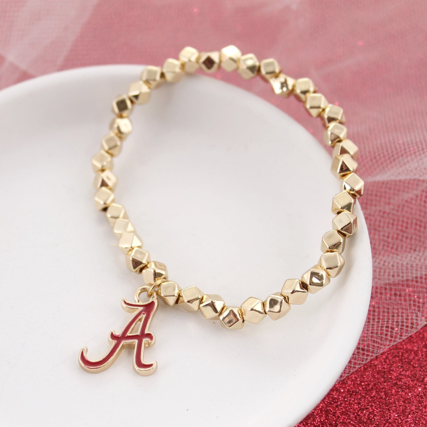 This lightweight stretch bracelet features shiny faceted gold beads and a crimson enamel Alabama “A” logo charm. The elastic design makes it easy and comfortable to wear all day. Great for stacking and matches perfectly with our shiny gold huggie earrings and gold herringbone necklace.