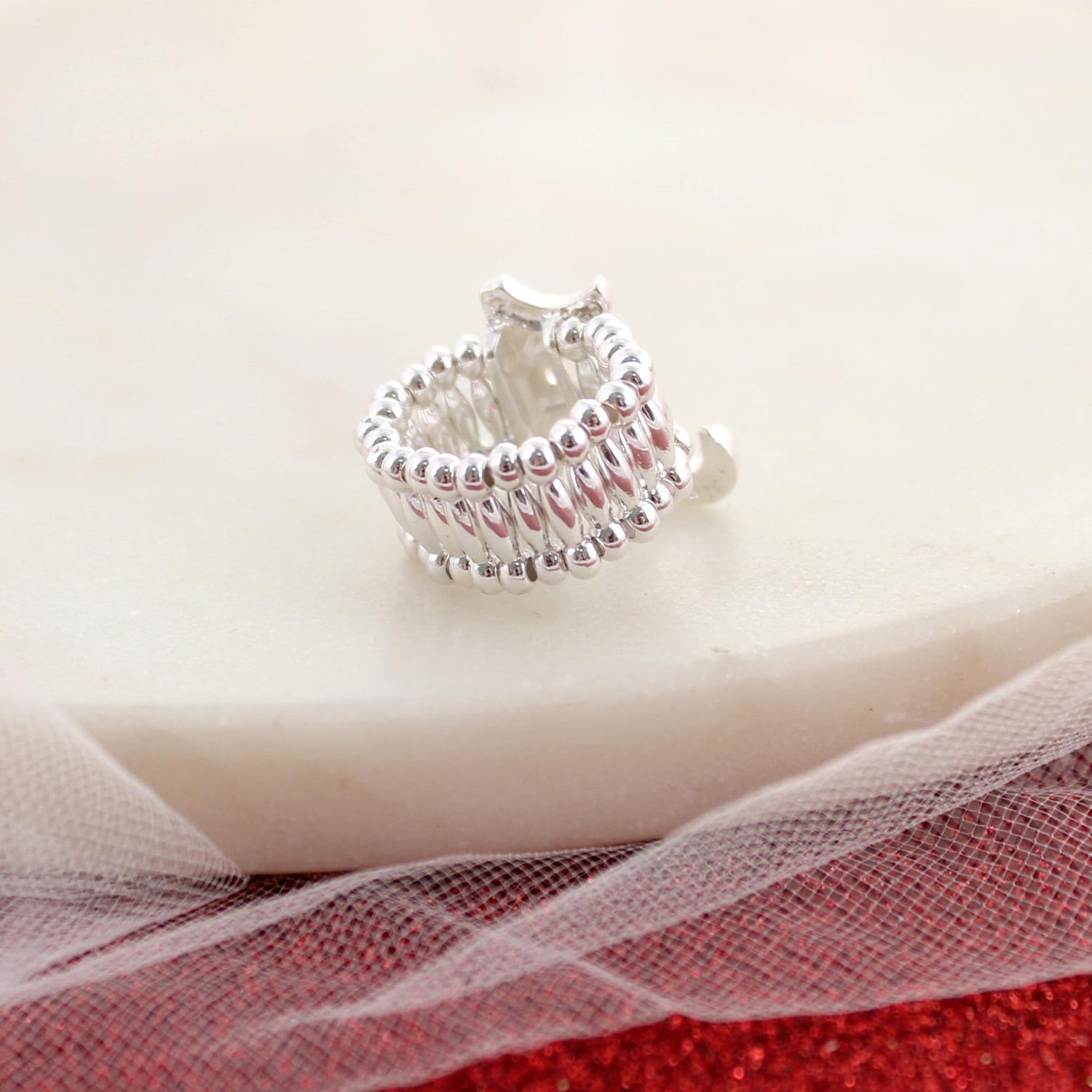 Show stopping University of Alabama stretch ring featuring crimson crystals set in a silver tone. The comfortable stretch band fits most finger sizes. Complete your game day look by pairing it with the matching Bama earrings, necklace, bracelet, and pin!
