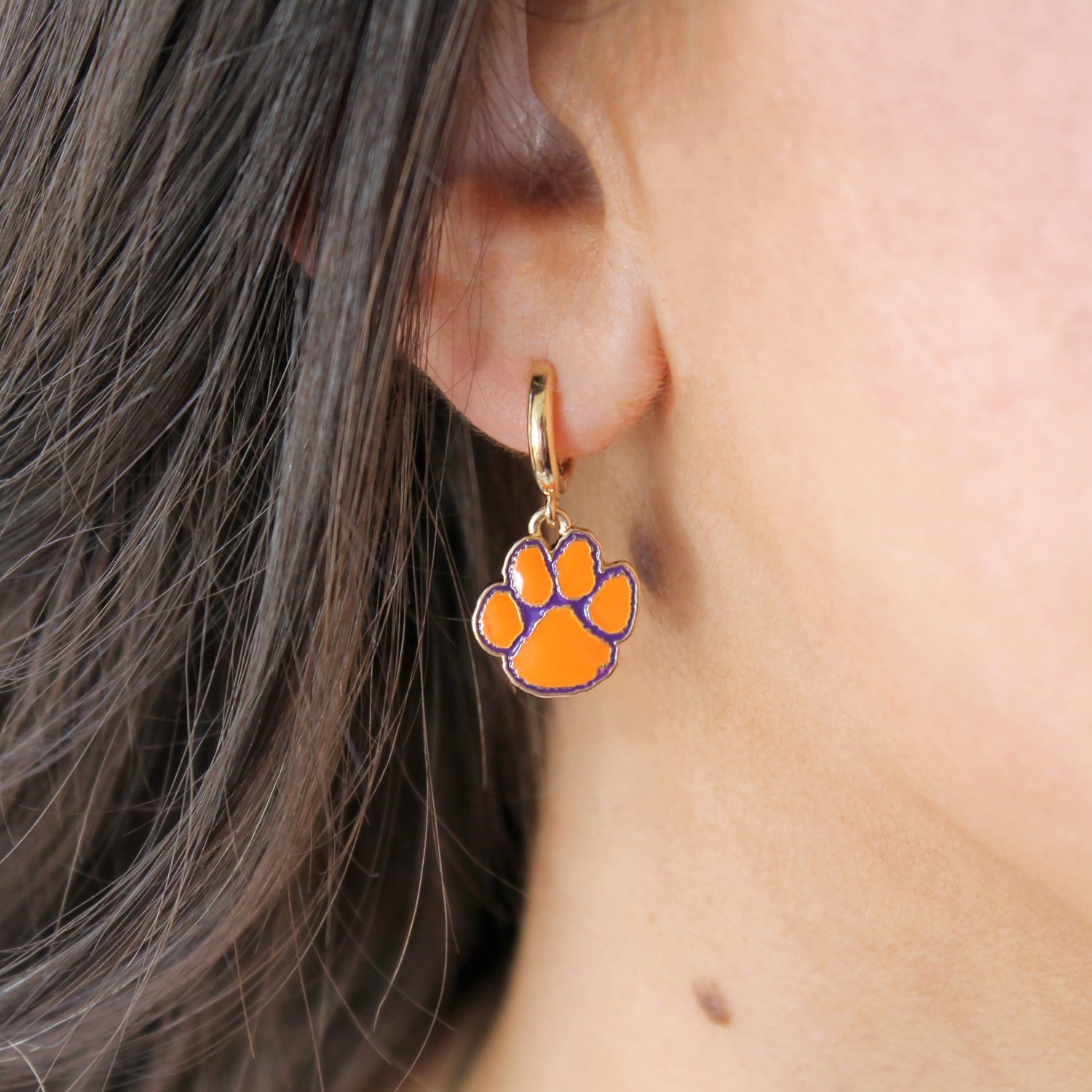 These shiny gold huggie hoop earrings feature lightweight orange and purple enamel Clemson paw logo charms with comfortable snap closures. Charms dangle 1/8" from the hoops. Designed to coordinate with the gold herringbone necklace and stretch bracelet for a complete game day look. Looks great with an earring stack.