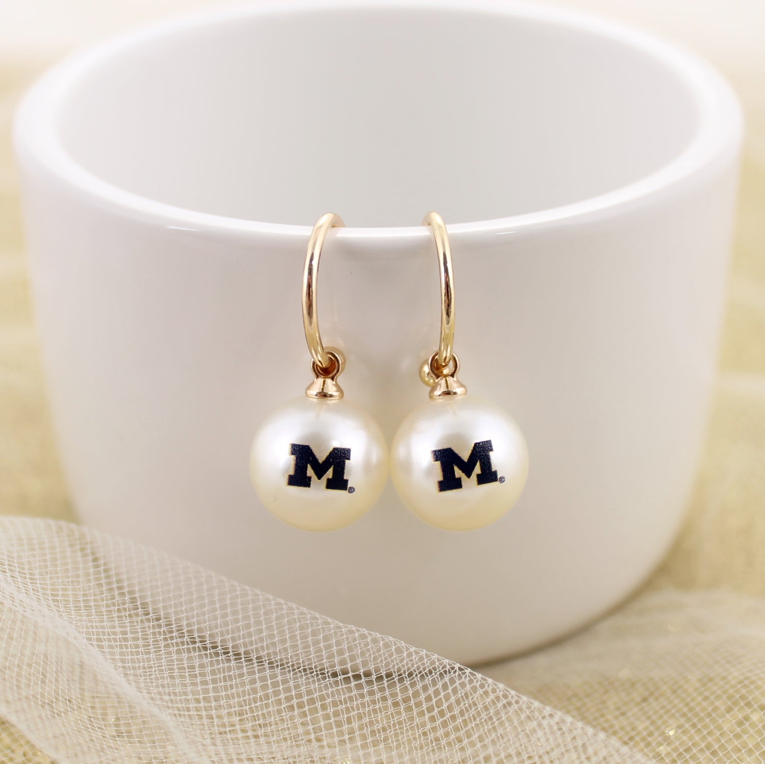These elegant earrings feature oversized 14mm imitation pearls with Michigan “M” logos on gold-tone open-back huggie hoops. Lightweight yet statement-worthy. Hoops measure ~ .5" in diameter. Designed to coordinate with our matching triple chain pearl pendant necklace.