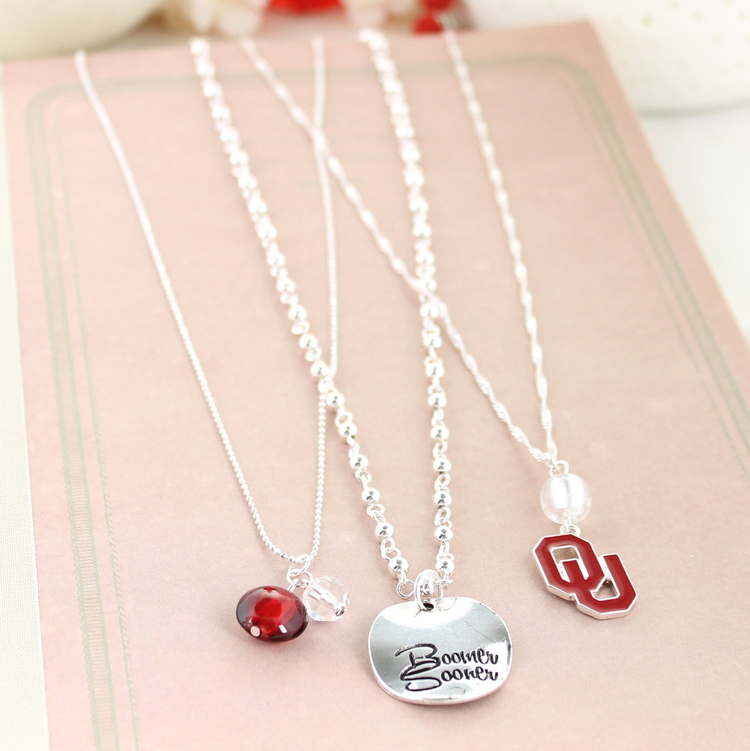 This 3-strand necklace set features three silver tone chains, each with a unique charm: a crimson and clear bead cluster, a "Boomer Sooner" stamped disc, and the Oklahoma “OU” logo. Each strand has its own clasp and unique chain style, so you can wear all together or separately. Lightweight, fun, and full of team pride.