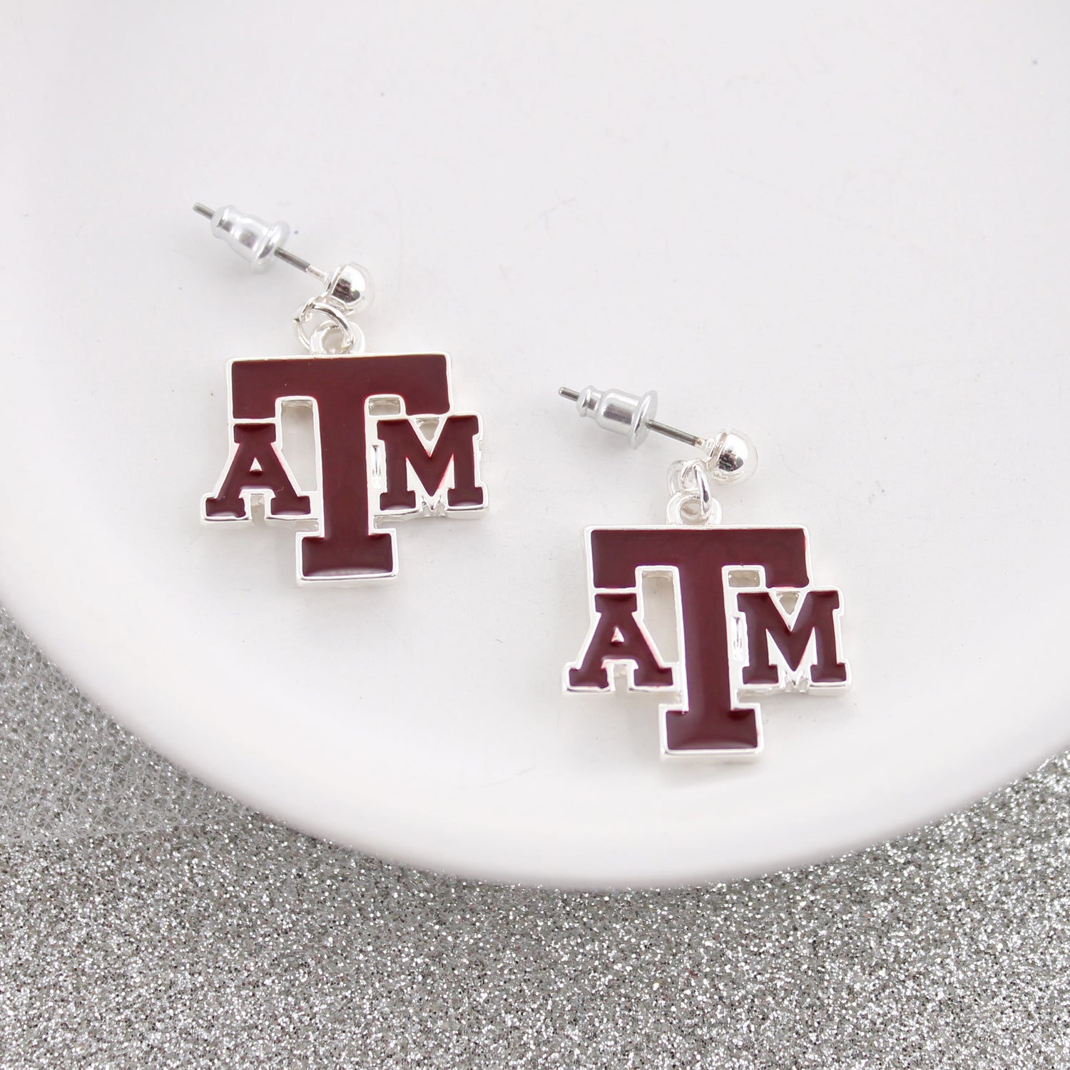 These silver tone Texas A&M University drop earrings feature the classic “TAM” enamel logo in maroon and silver on lightweight post backs. A bold yet easy-to-wear design, they pair perfectly with other enamel pieces from our Texas A&M collection. Whether for game day or campus life, they bring your Aggie pride to life!