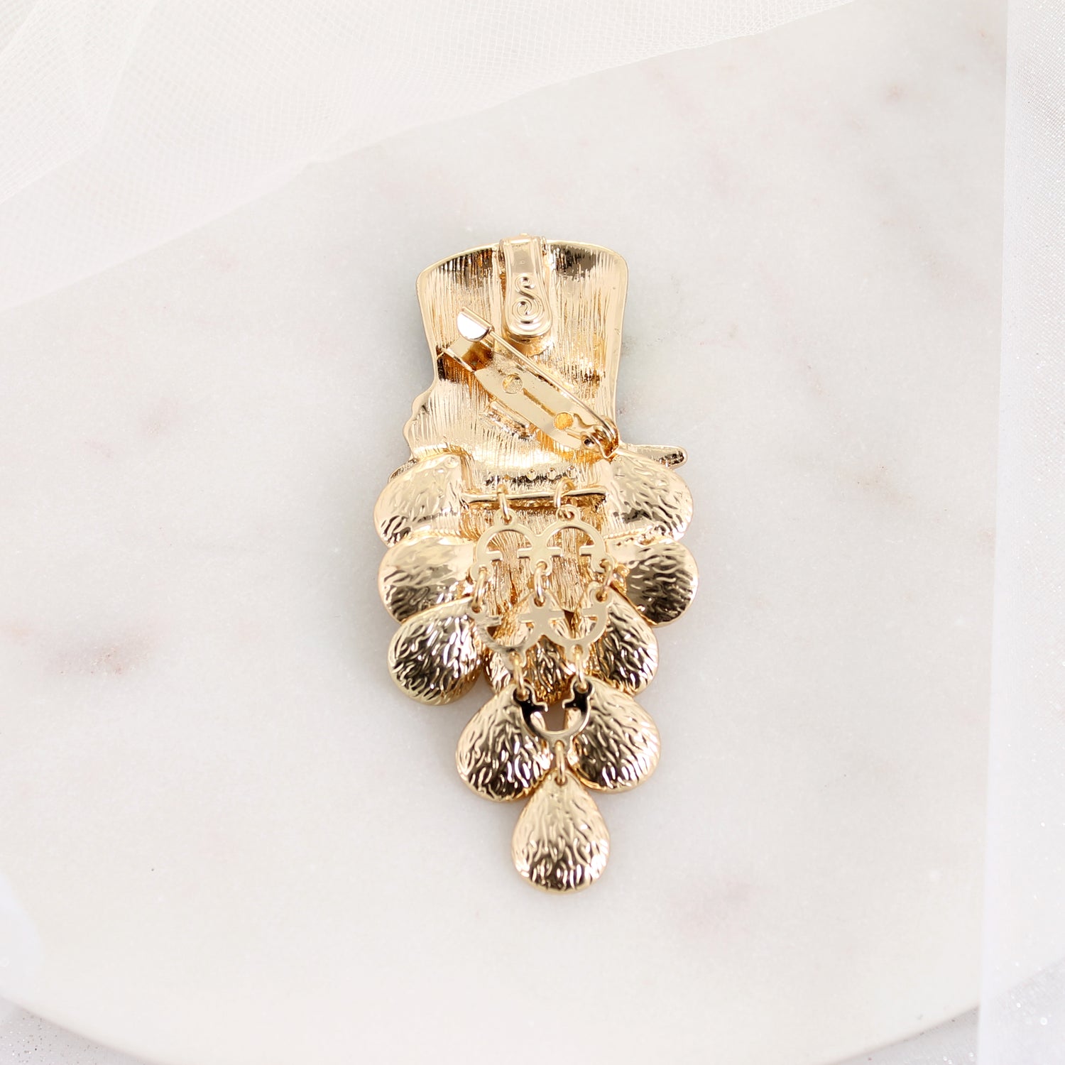 Gold tone magnetic clasp St. Patrick’s Day pin/pendant featuring a dangle beard leprechaun design with glitter enamel accents. Pin/pendant measures approximately 3" in height.