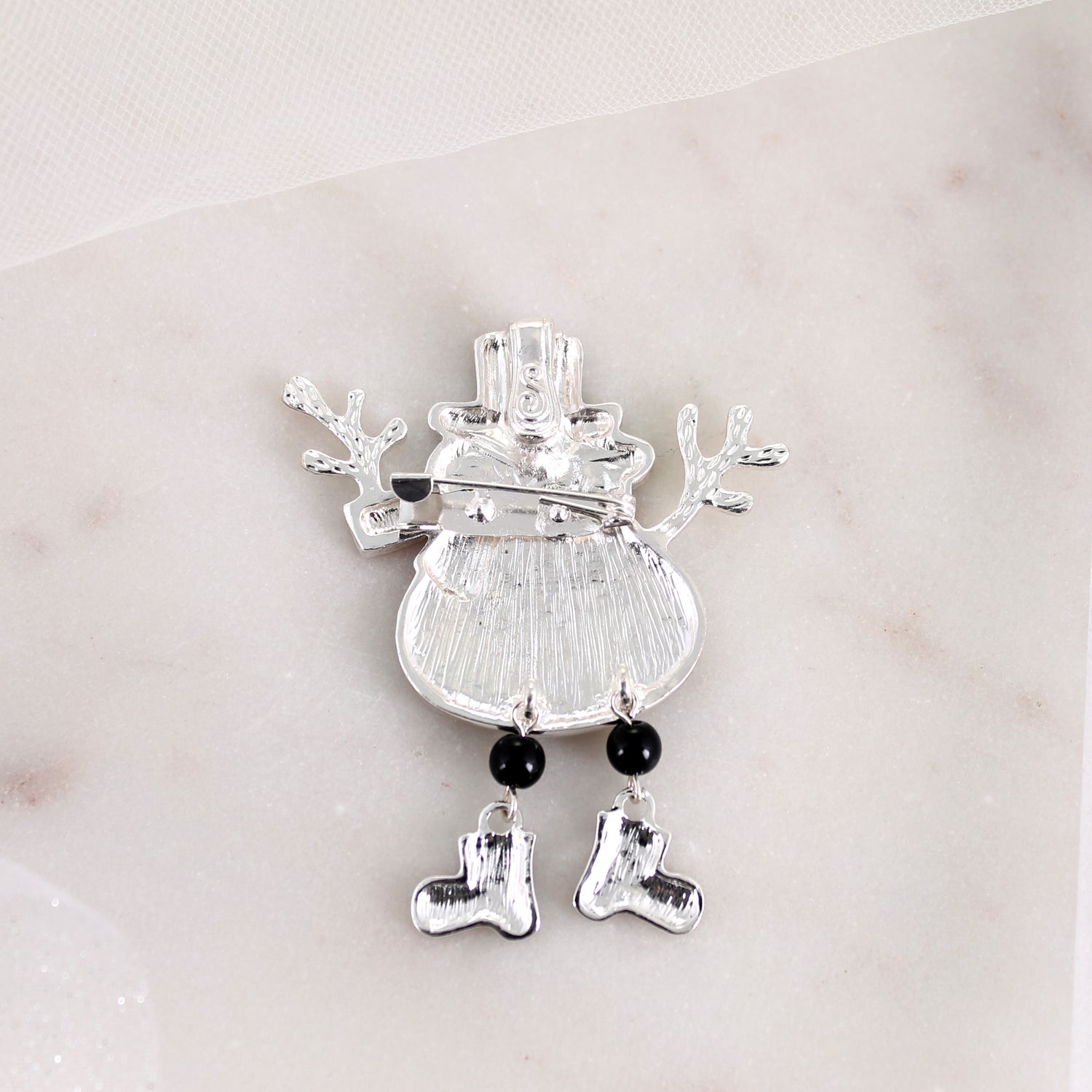 Silver tone magnetic clasp pin/pendant featuring a crystal snowman design with enamel accents and dangling legs. The perfect amount of sparkle for Christmas! Pin measures approximately 2.5" in height.