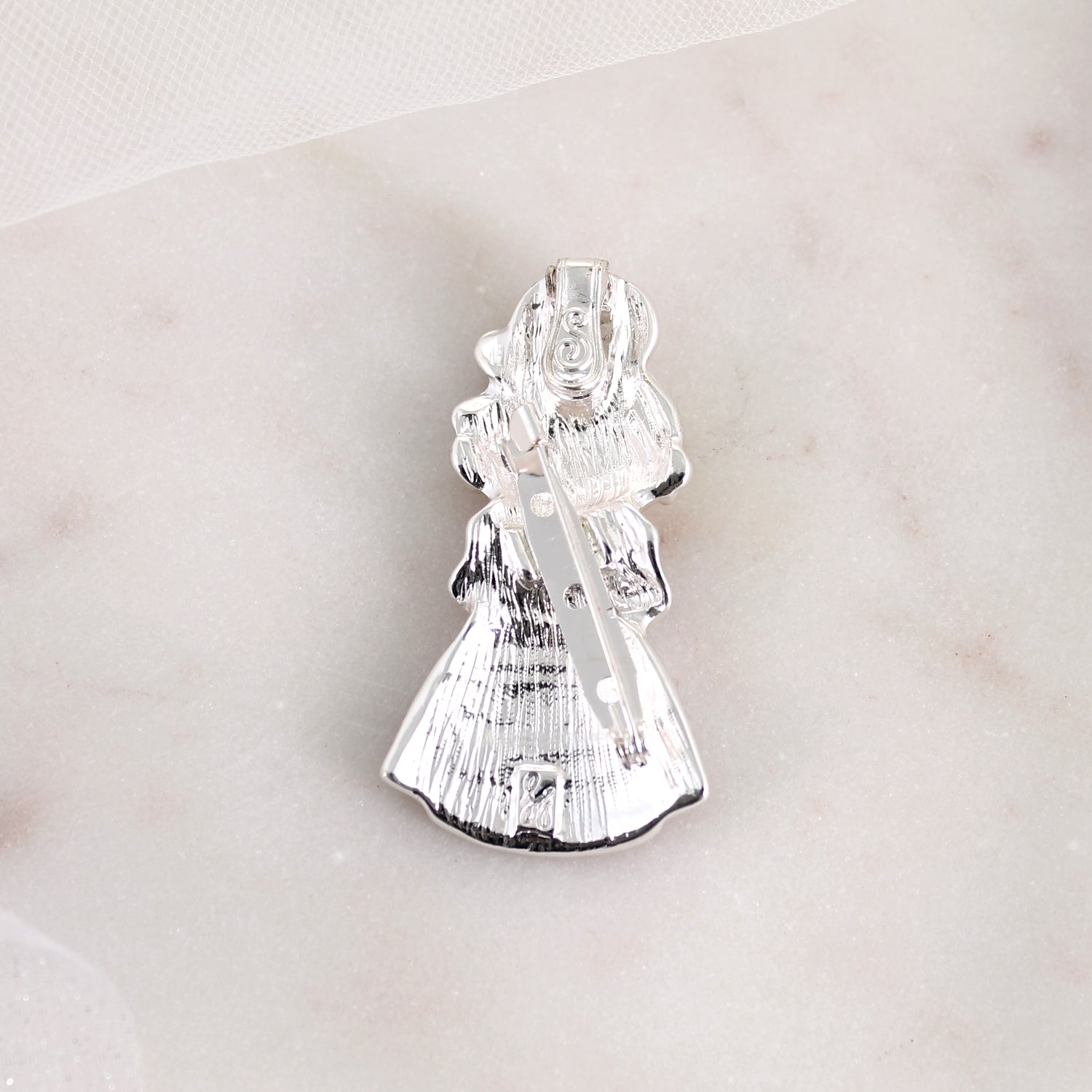 Silver tone magnetic clasp pin/pendant featuring a glitter enamel Mrs. Claus design. Perfect for Christmas! Pin/pendant measures 2.25” in height.