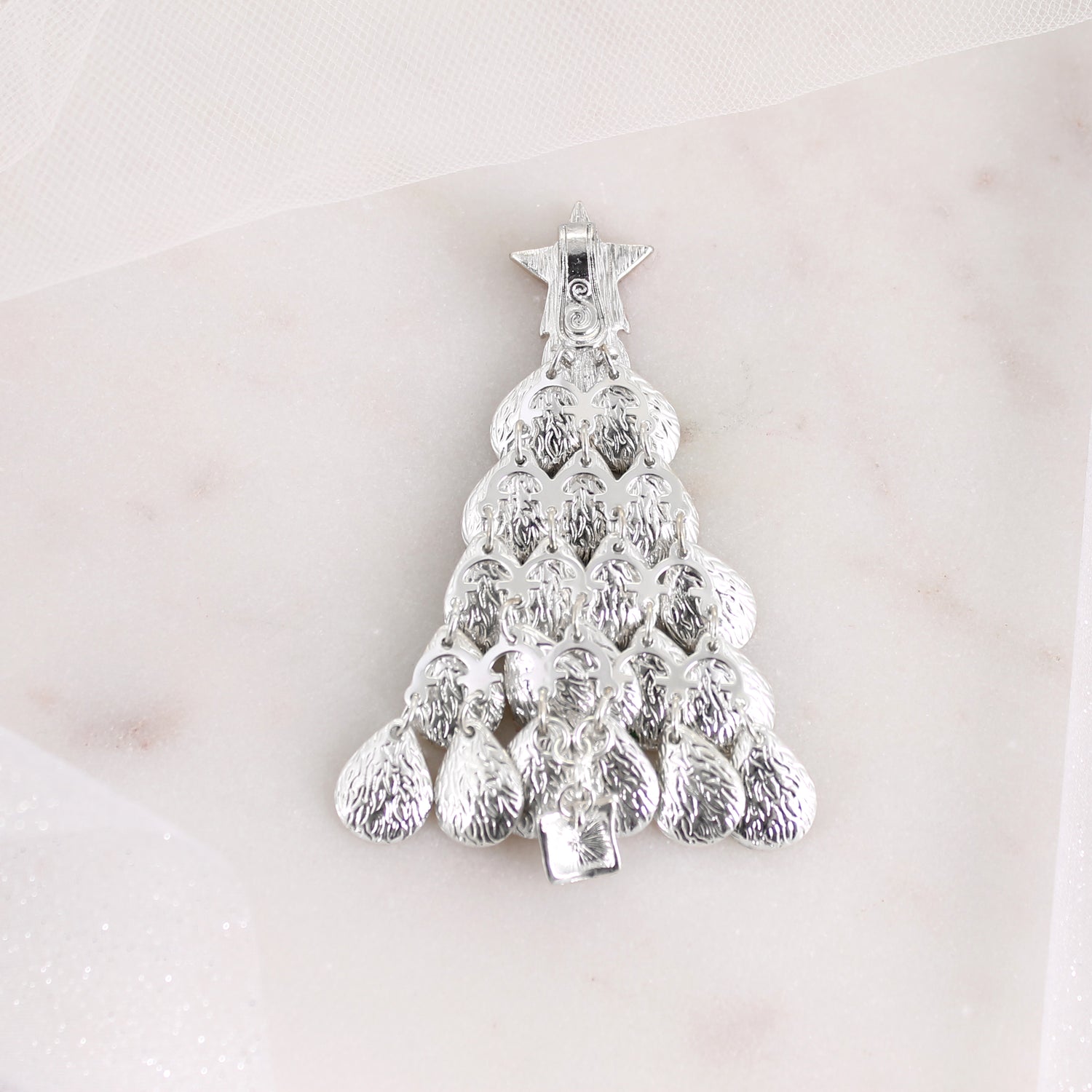 Silver tone magnetic clasp pendant featuring a dangle Christmas tree design with green and red enamel accents. Tree measures approximately 3.5” in height.