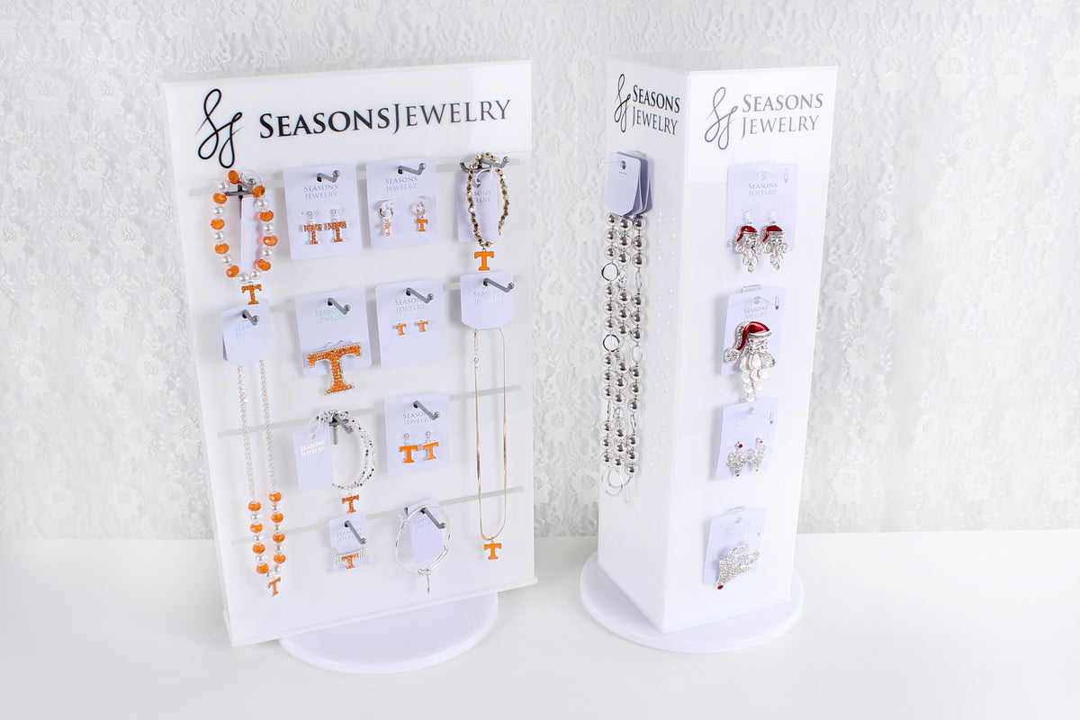 Slat-wall functionality allows you to customize the peg placement to suit your Seasons Jewelry order in a multitude of options.