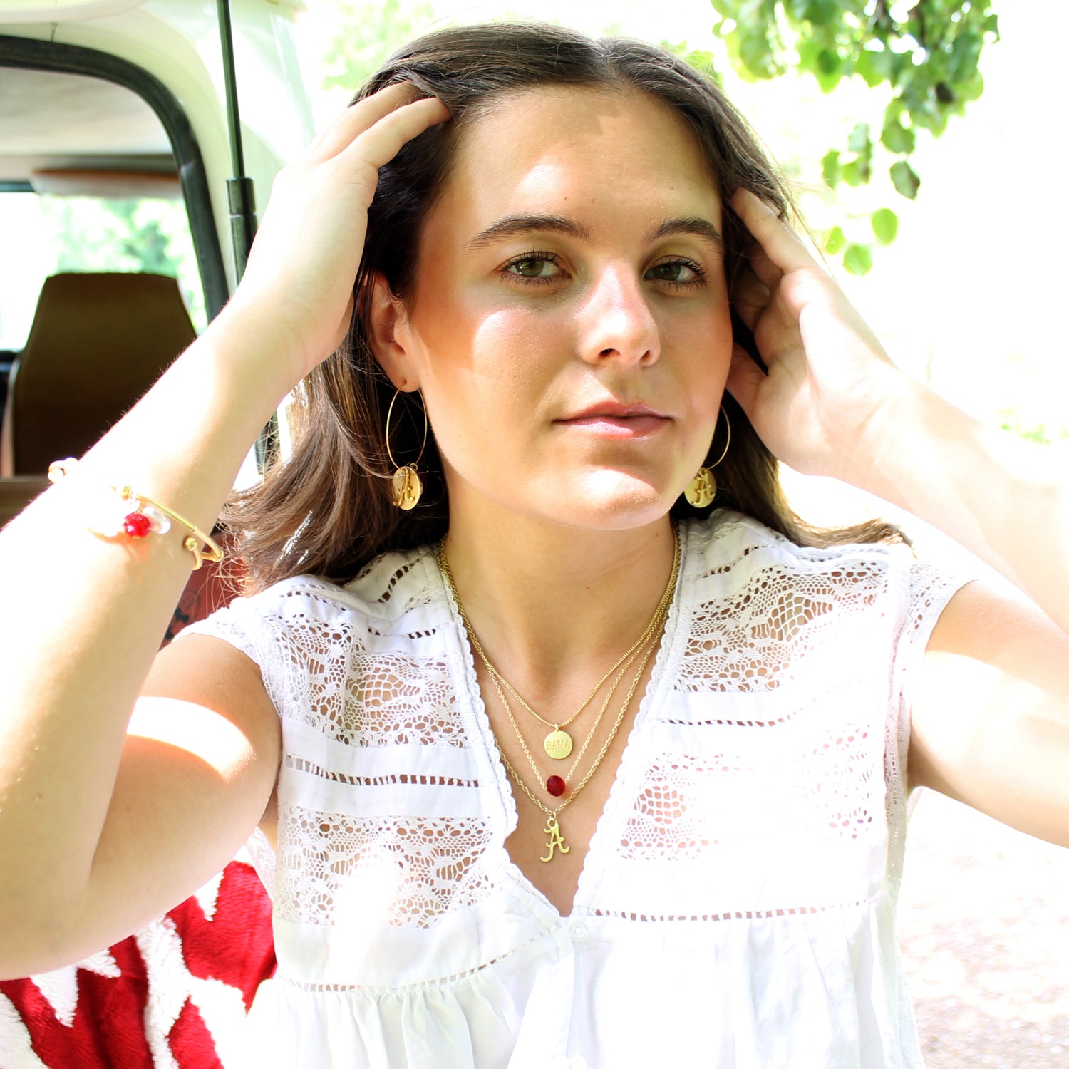 This gold tone Bama charm bracelet features a beaded wrap bangle design with a dangling Alabama “A” logo charm and bold crimson and clear faceted bead accents. Lightweight and flexible, it’s great on its own or stacked with other pieces. An easy way to show team spirit with a modern twist. Fits wrist sizes of 5.5 - 8". Cluster dangles .75" below bracelet. The wrap style makes this piece easy to put on and take off!