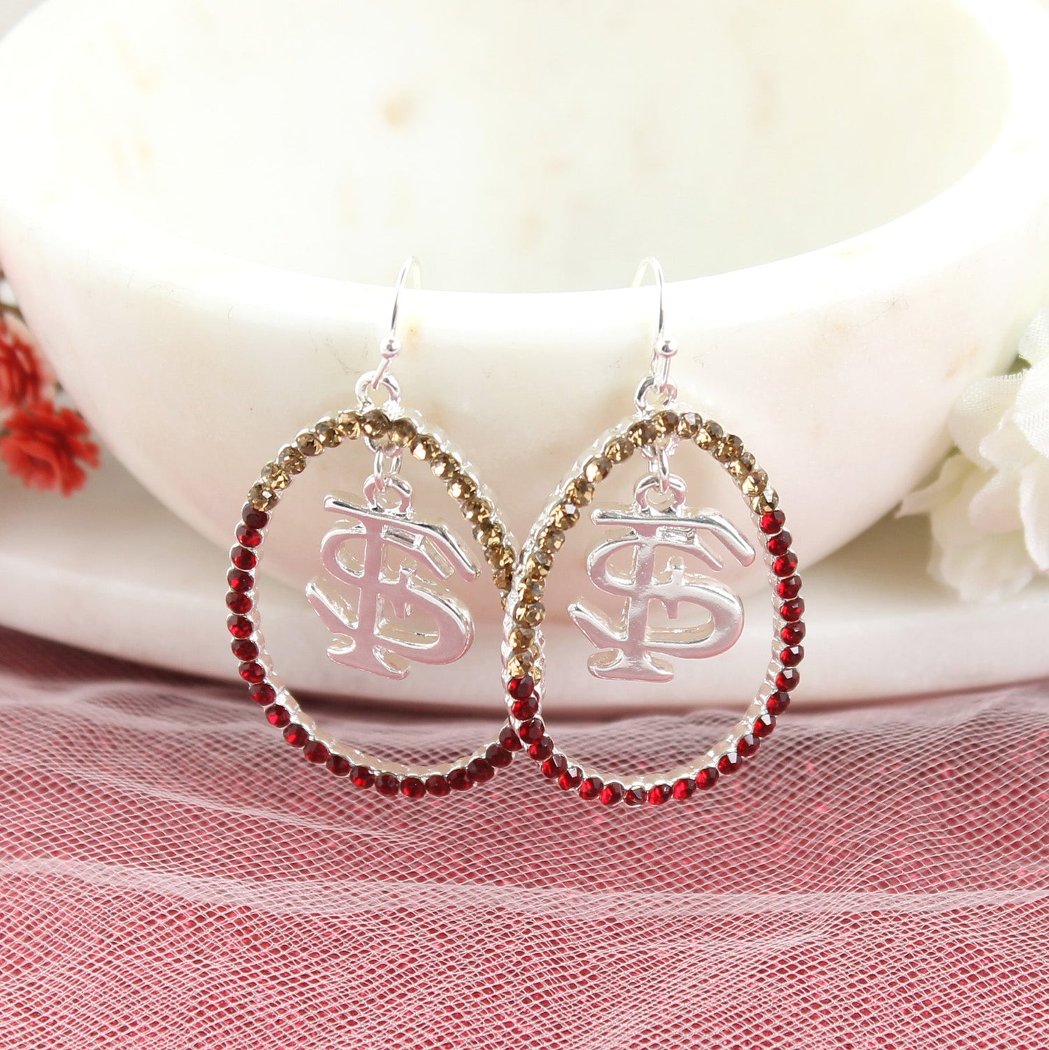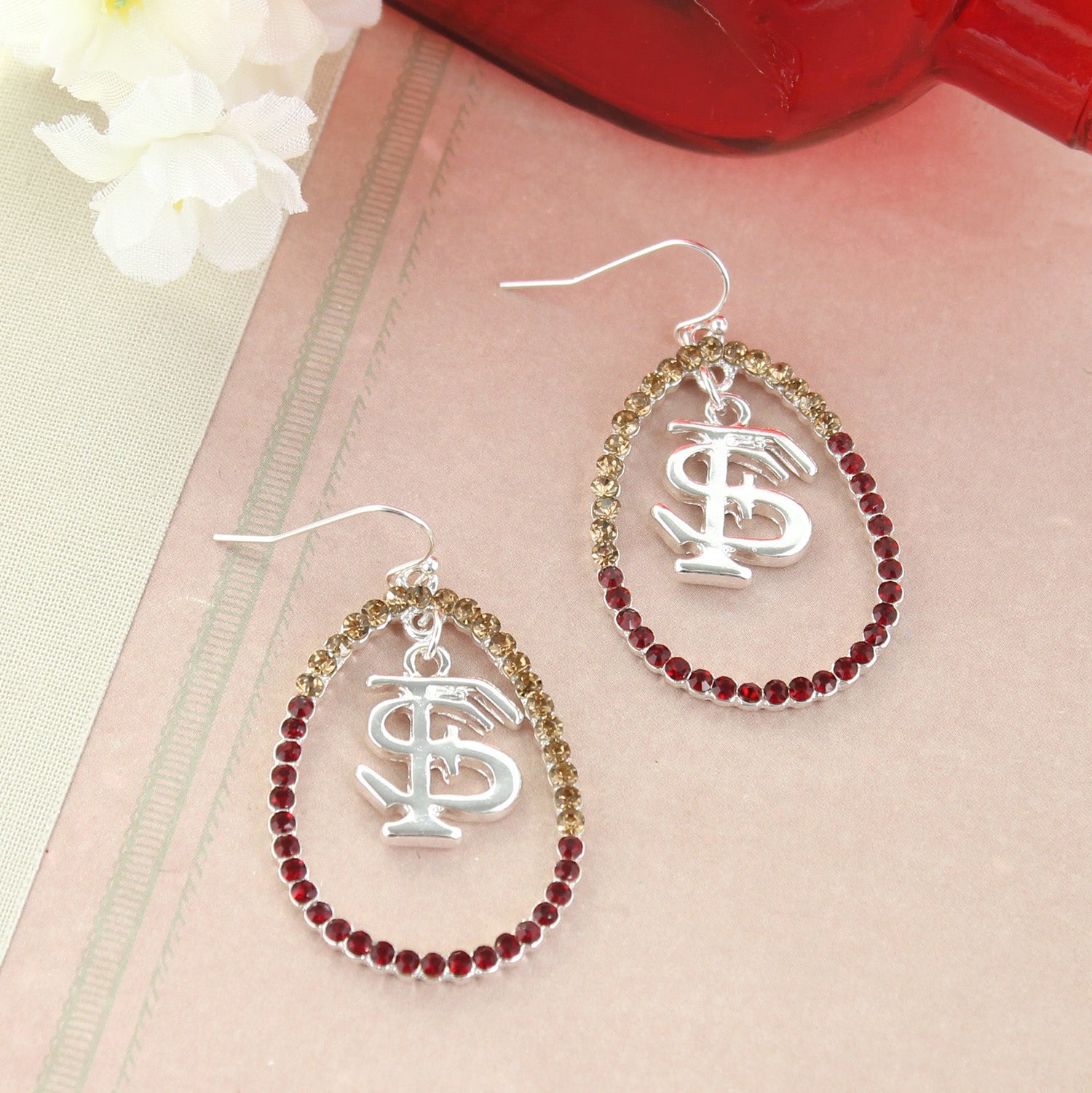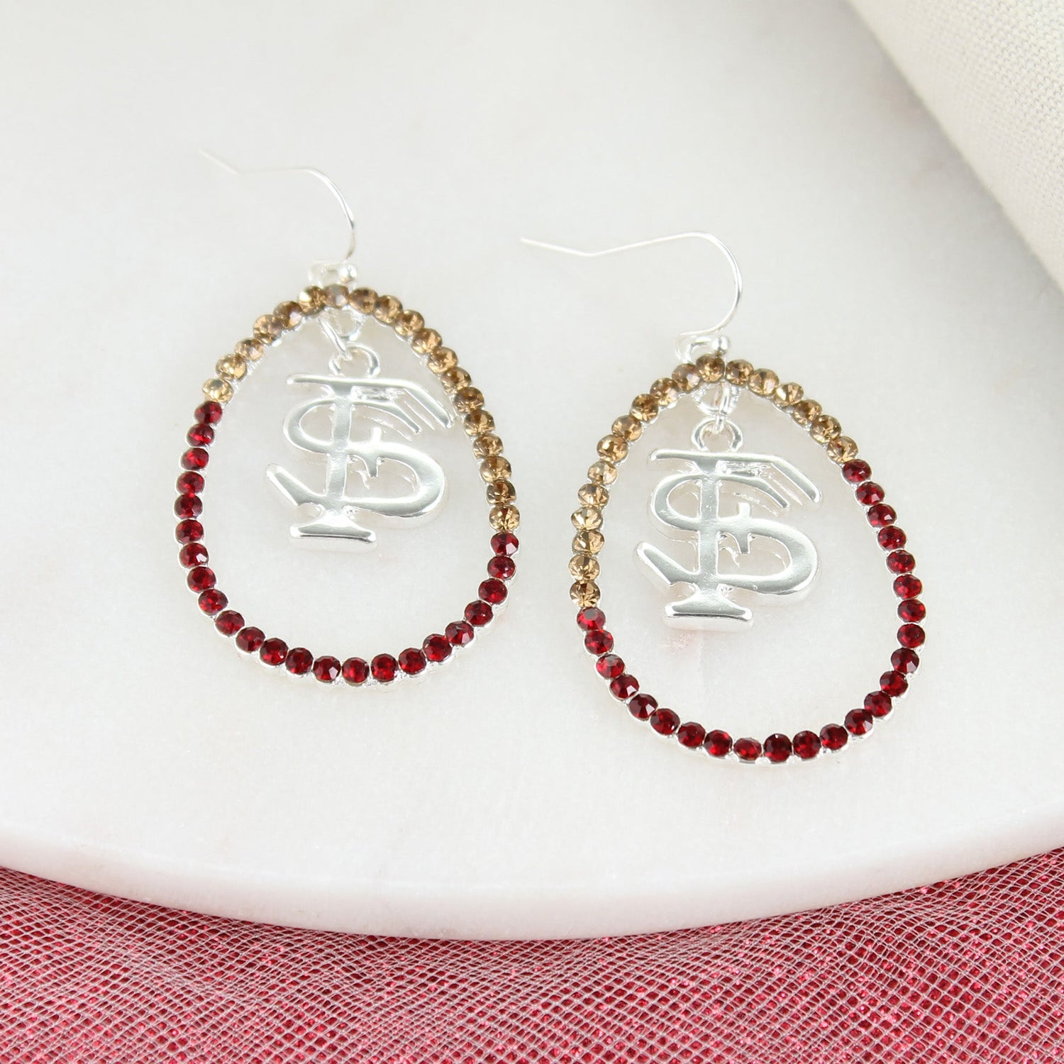 These eye-catching Florida State earrings feature silver tone open teardrop loops with faceted garnet and gold crystals and a dangling “FS” logo charm. Lightweight with a high sparkle finish. Pairs perfectly with our coordinating crystal loop necklace for a polished game day look.