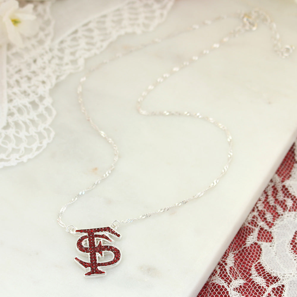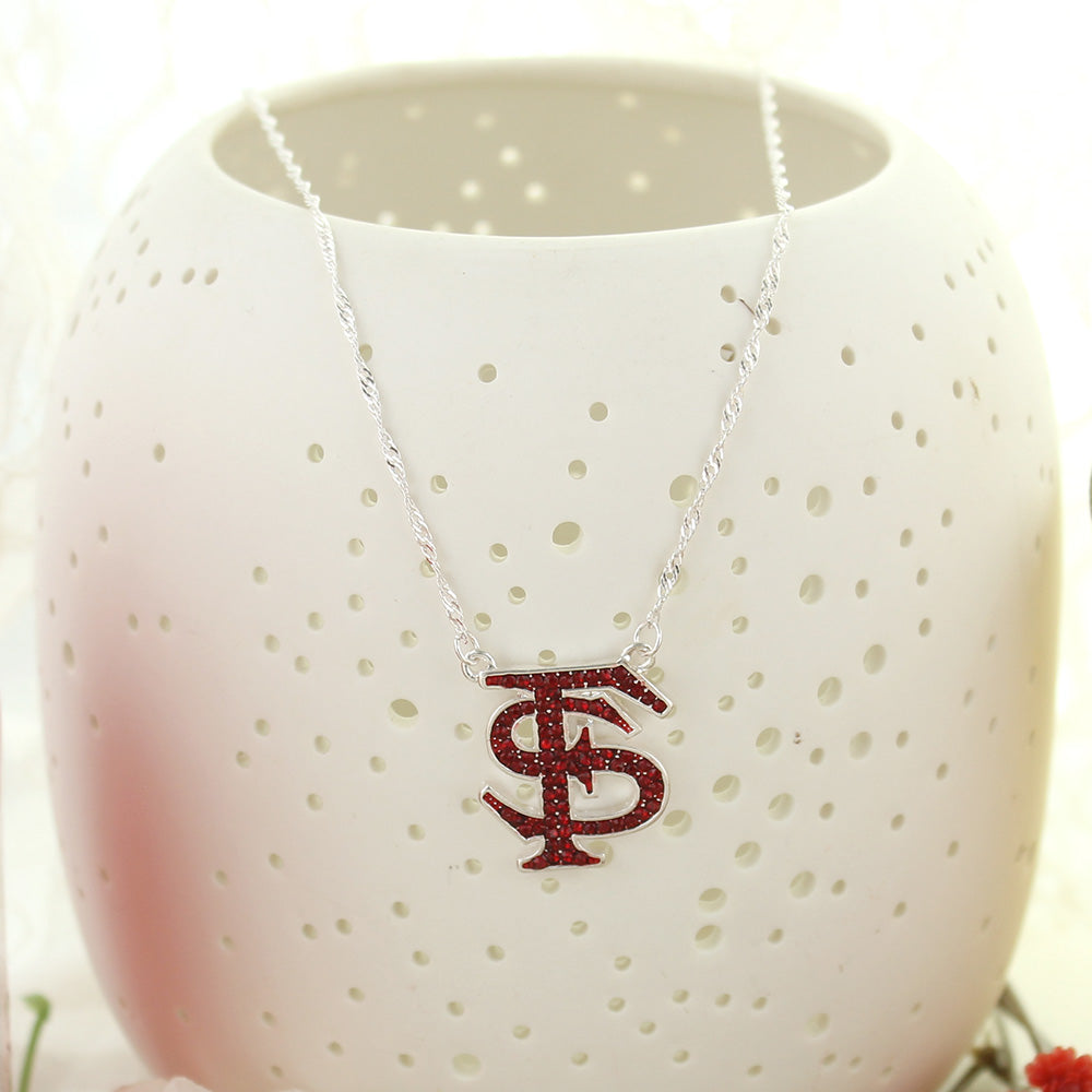 This beautiful Florida State University necklace features a silver tone chain measuring 16" with a 3" extender and claw clasp for easy adjustment. The “FS" logo charm is accented with sparkling garnet crystals. Perfect on its own or paired with our matching FSU crystal logo earrings, bracelet, and pin!