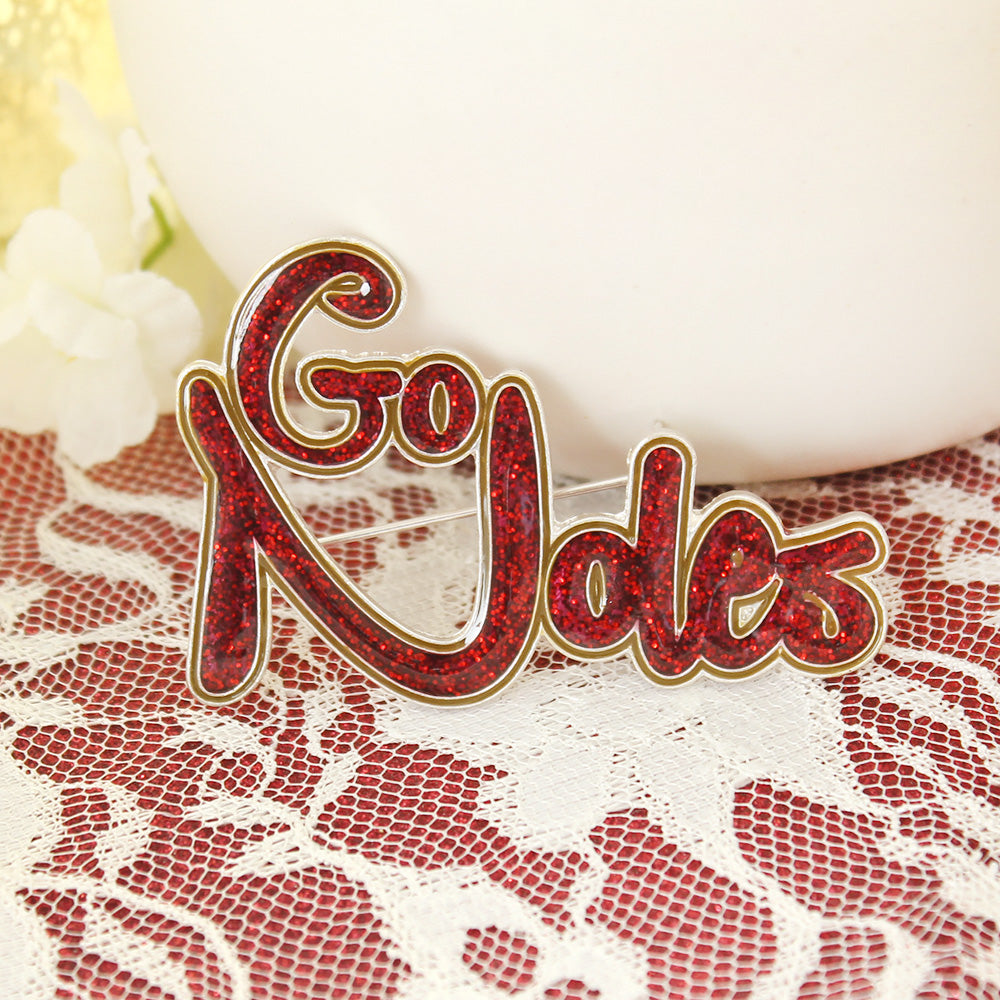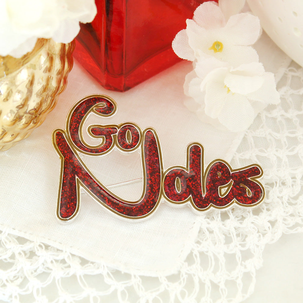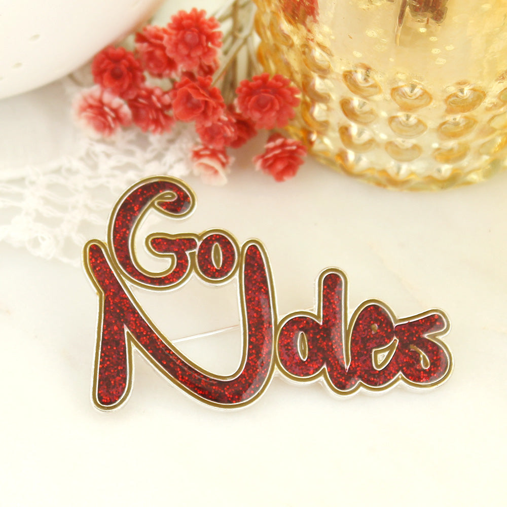 This eye-catching “Go Noles” pin features our signature glitter enamel in a bold script font. Measuring approximately 2.5” wide, it includes a standard pin back and adds a spirited pop to crossbody bags, visors, scarves, jean jackets, and more. Lightweight yet durable, it’s perfect for game day flair. Coordinates with the matching bracelet, earrings, and necklace.