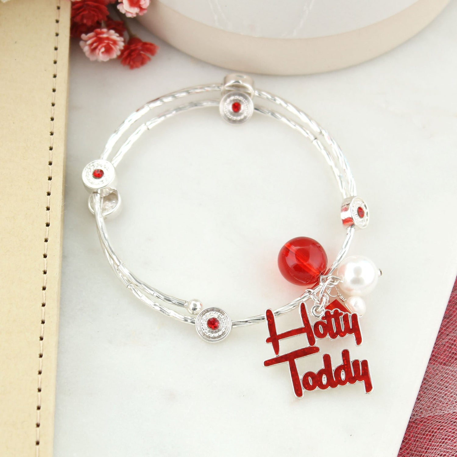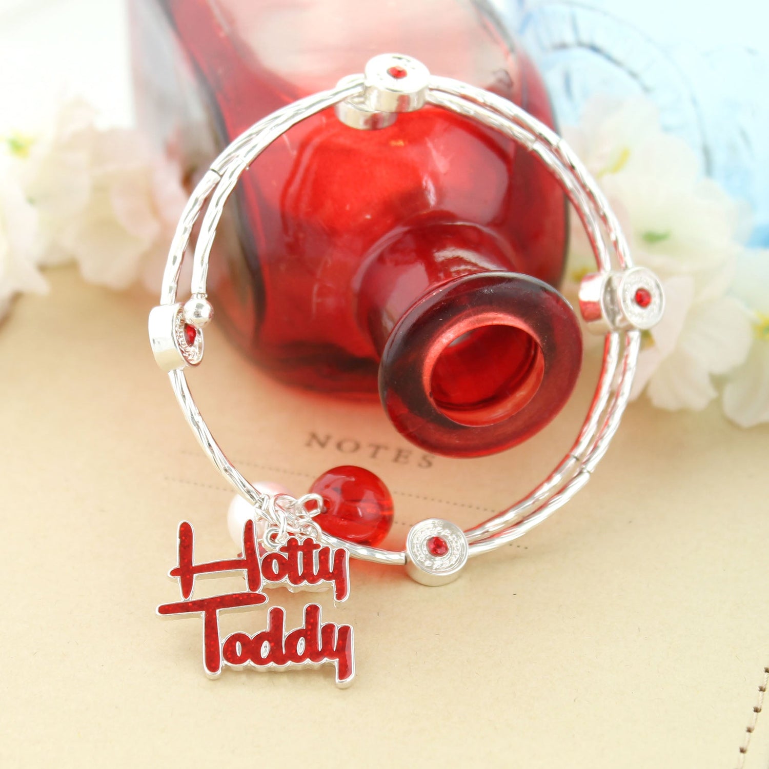 This silver tone wrap bracelet features our signature glitter enamel “Hotty Toddy" charm alongside a bold red bead, faux pearl, and red crystal dangle. The bracelet adjusts easily to fit wrist sizes from 5.5" to 8", and the charm cluster dangles approximately .75" below the bracelet. Sparkling red accents throughout the band complete the look. Coordinates with matching earrings, pin, and necklace from the same Ole Miss glitter enamel slogan set.