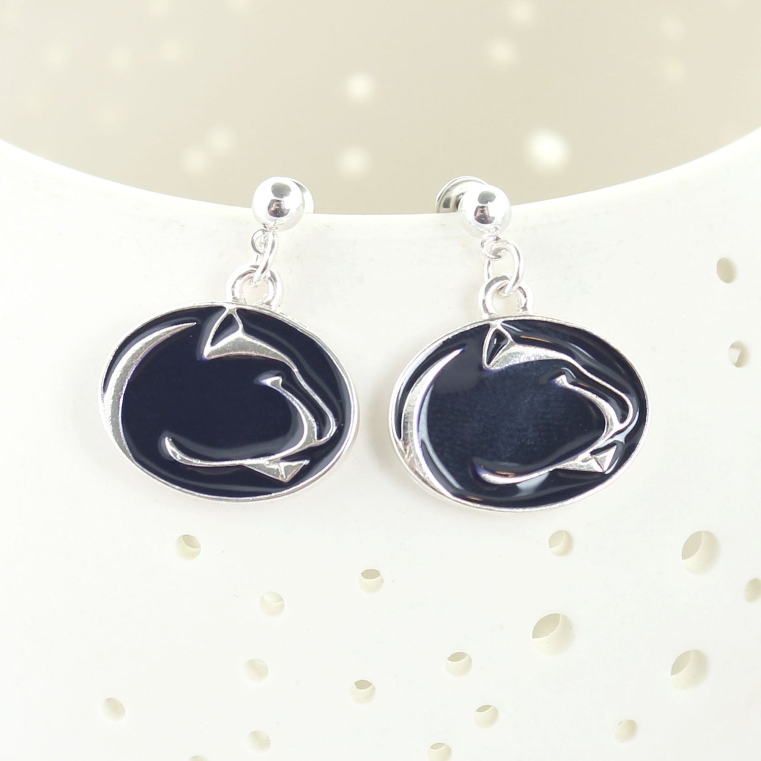 These silver tone Penn State University drop earrings feature the classic Nittany Lion enamel logo in navy blue and silver on lightweight post backs. A bold yet easy-to-wear design, they pair perfectly with other enamel pieces from our Penn State collection. Whether for game day or campus life, they bring your Lion pride to life!
