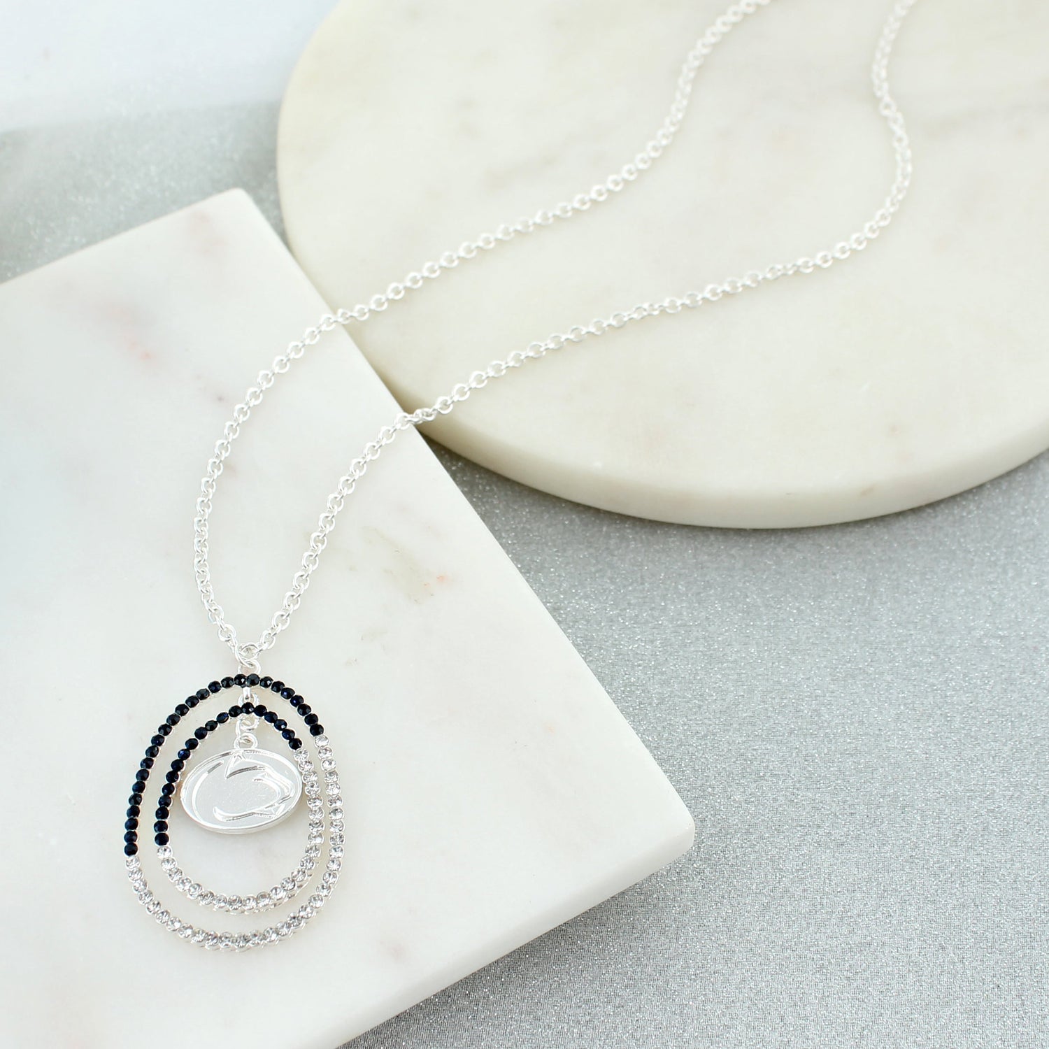 This stunning crystal loop necklace features faceted navy and clear crystals in a silver tone, double teardrop loop with a suspended Penn State Nittany Lion logo charm. It's a standout piece on its own or when worn with our matching crystal loop earrings.