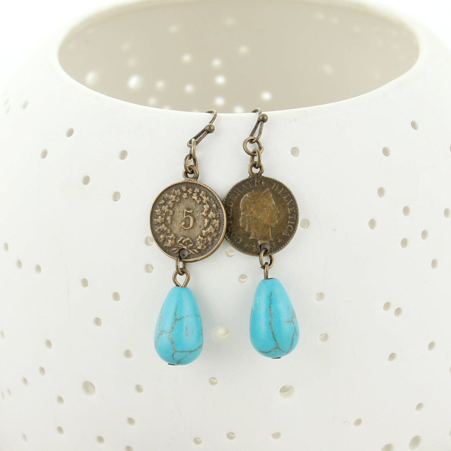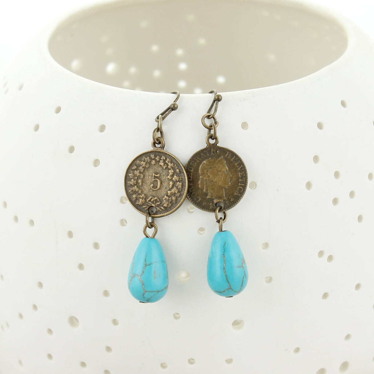 Vintage tone shepherd hook earrings featuring a turquoise teardrop stone and small coin charm. Earrings measure about 1.5” in length.