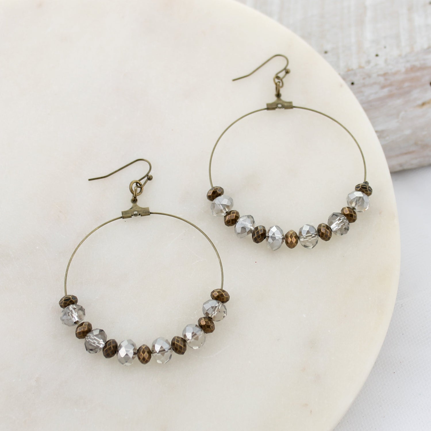 Vintage tone hoop earrings on shepherd hooks with smokey gray crystal beads. Hoops measure about 2 inches in diameter.