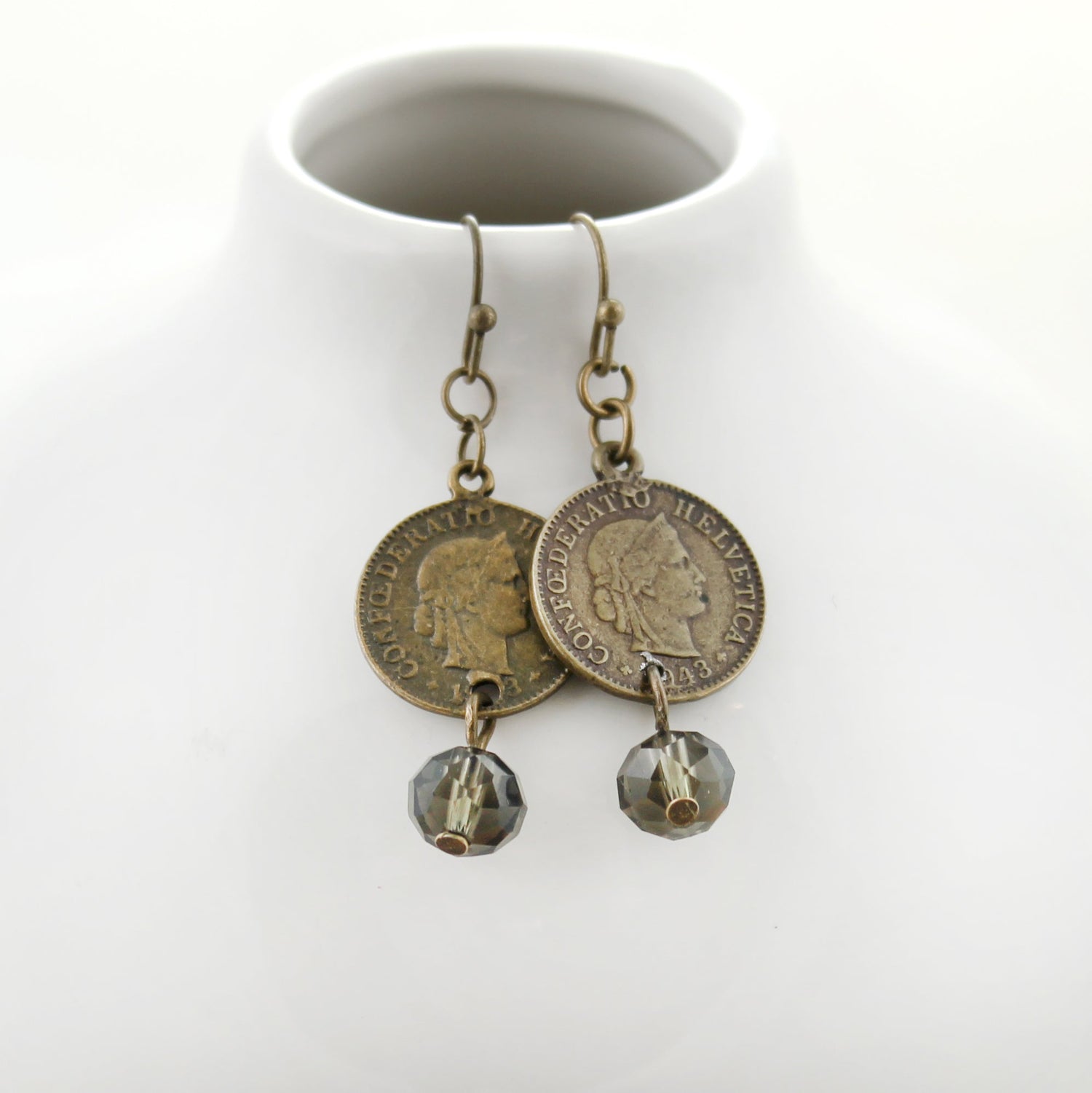 Vintage tone shepherd hook earrings featuring a coin and smokey taupe faceted crystal bead. Earrings measure approximately 1” in height.