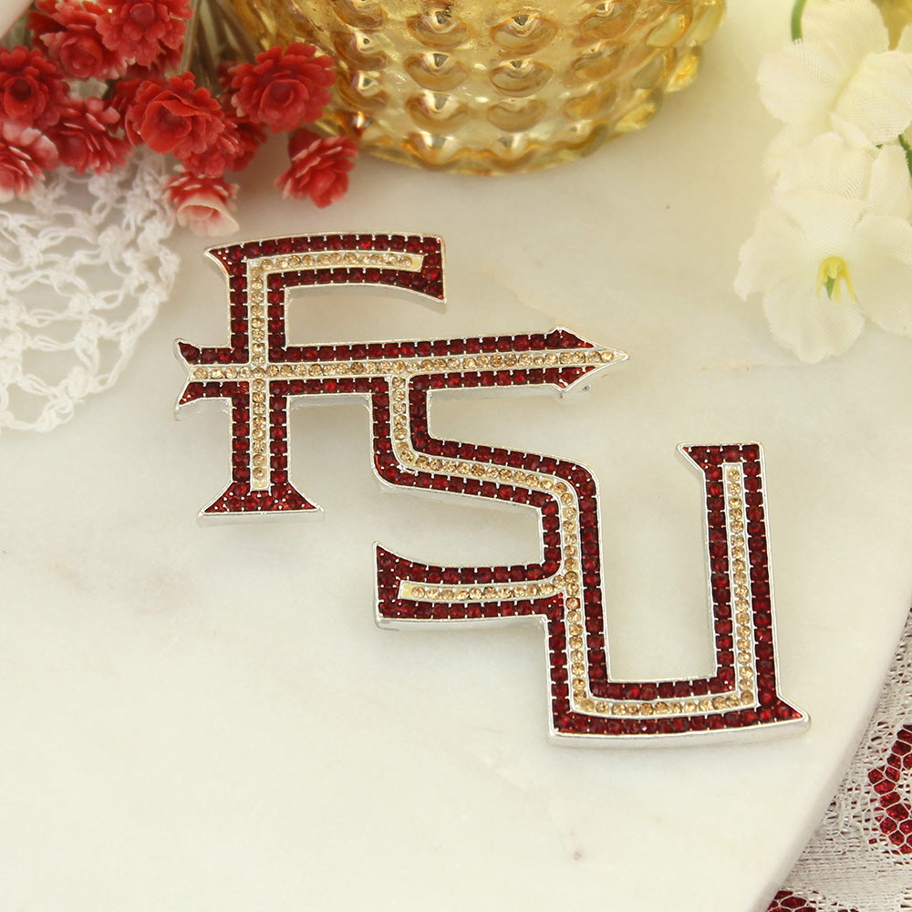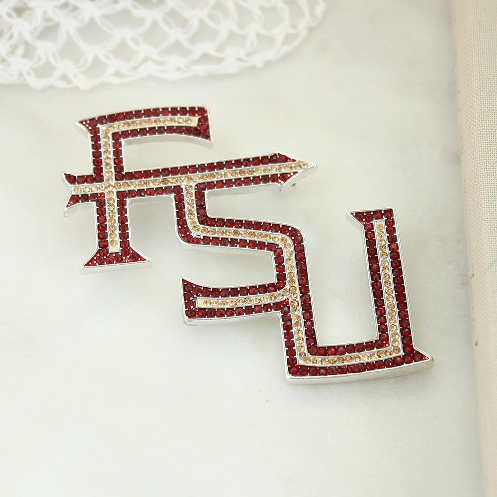 Add a pop of Nole pride with this silver tone Florida State University "FSU" logo pin, accented with sparkling garnet and gold crystals. Perfect for styling on jackets, scarves, hats, bags, and more. A must-have for Seminole fans!