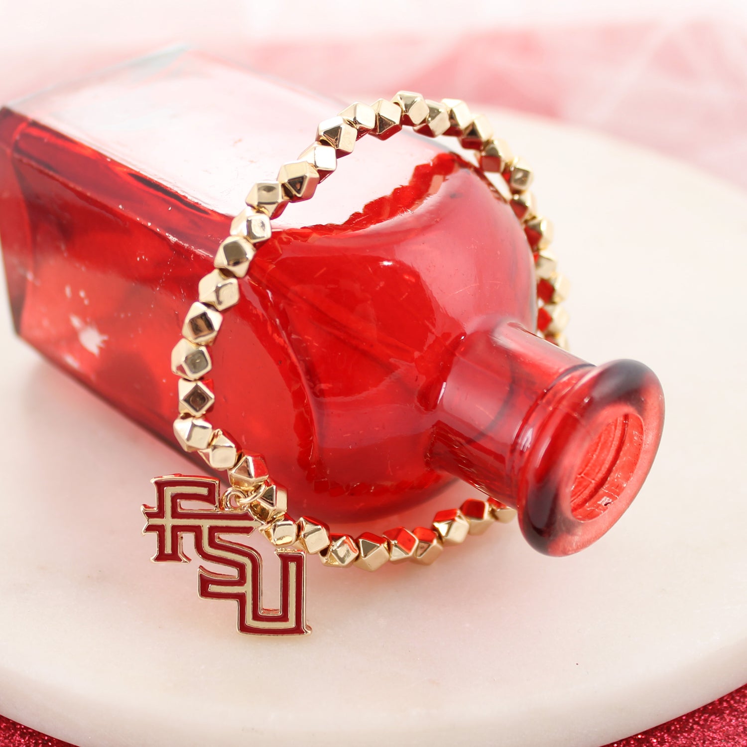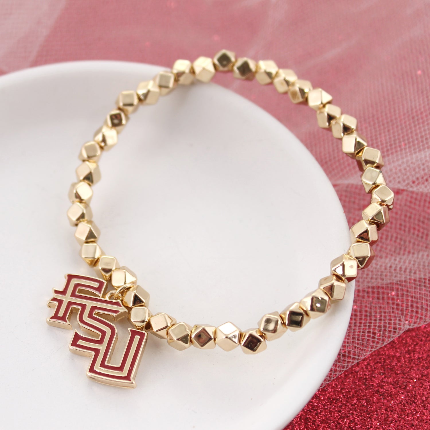 This lightweight stretch bracelet features shiny faceted gold beads and a garnet and gold enamel Florida State “FSU” logo charm. The elastic design makes it easy and comfortable to wear all day. Great for stacking and matches perfectly with our shiny gold huggie earrings and gold herringbone necklace.
