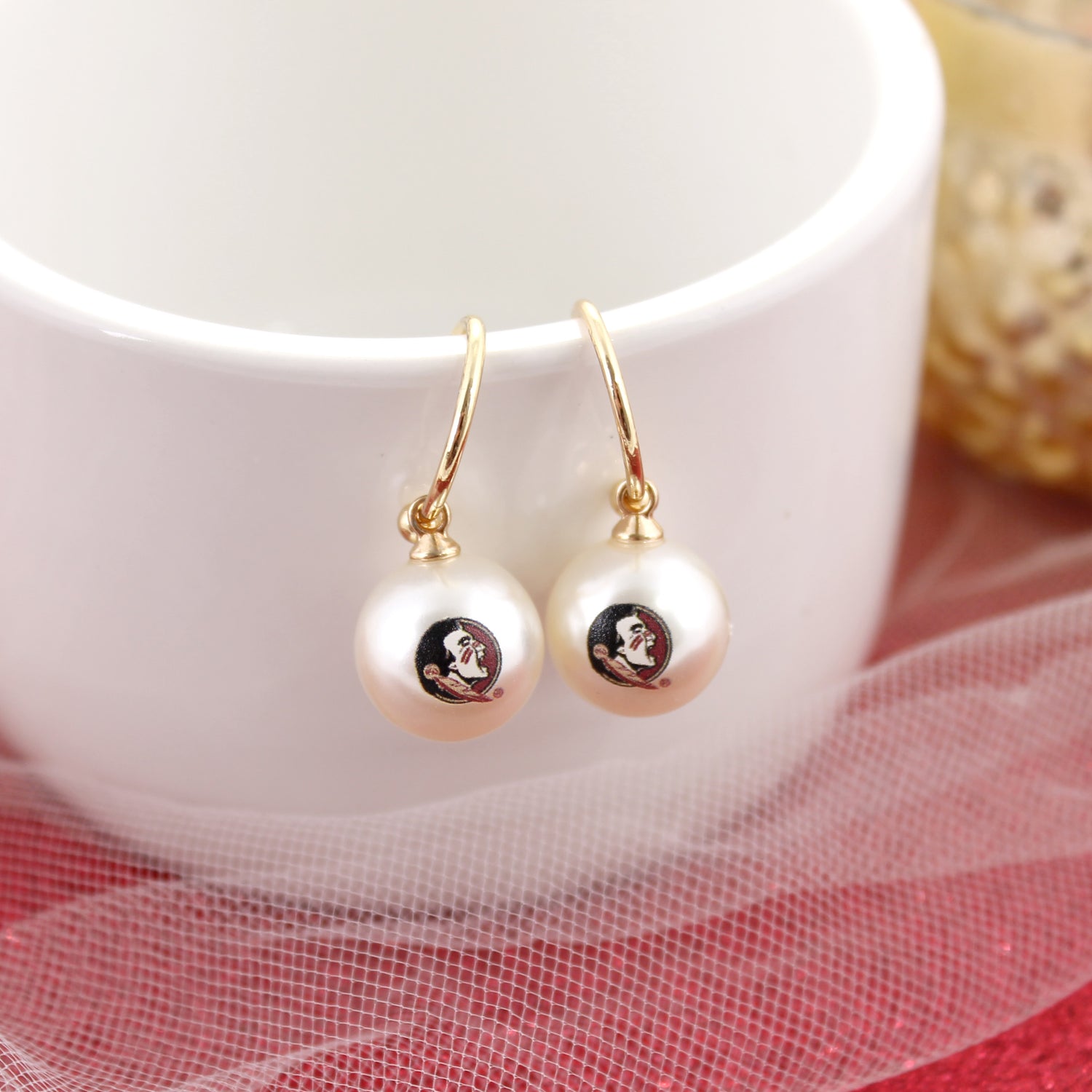 These elegant earrings feature oversized 14mm imitation pearls with Florida State Chief Osceola logos on gold-tone open-back huggie hoops. Lightweight yet statement-worthy. Hoops measure ~ .5" in diameter. Designed to coordinate with our matching triple chain pearl pendant necklace.