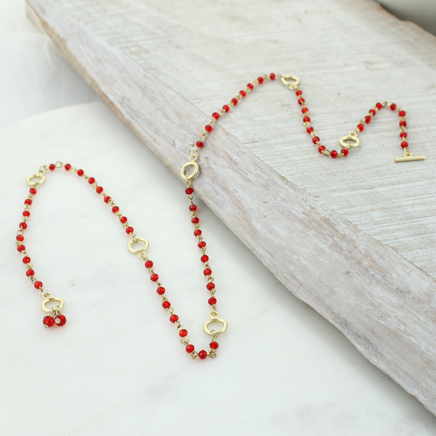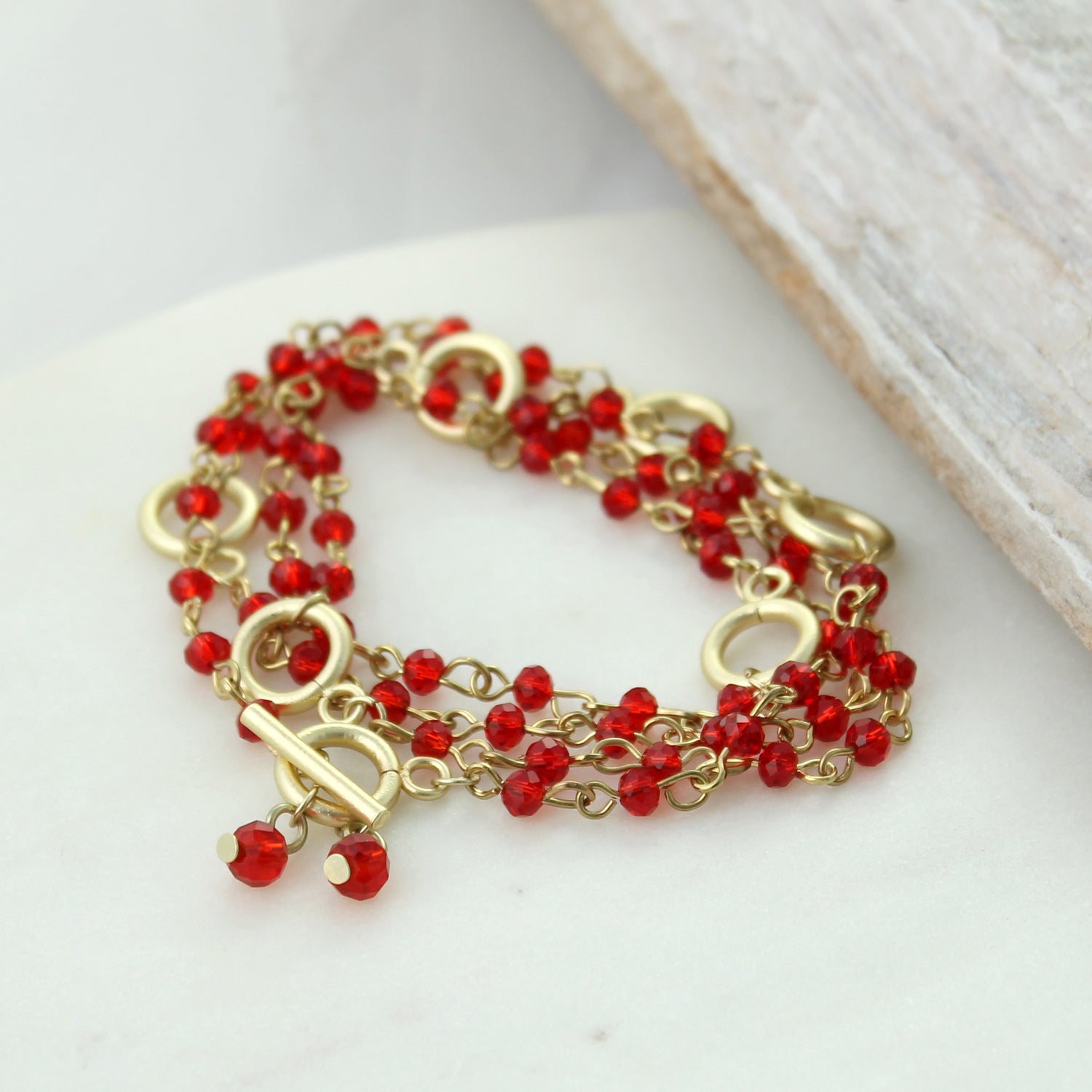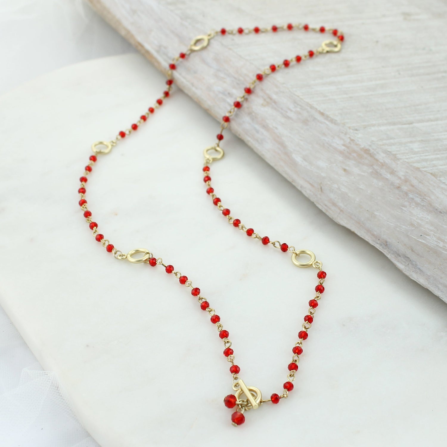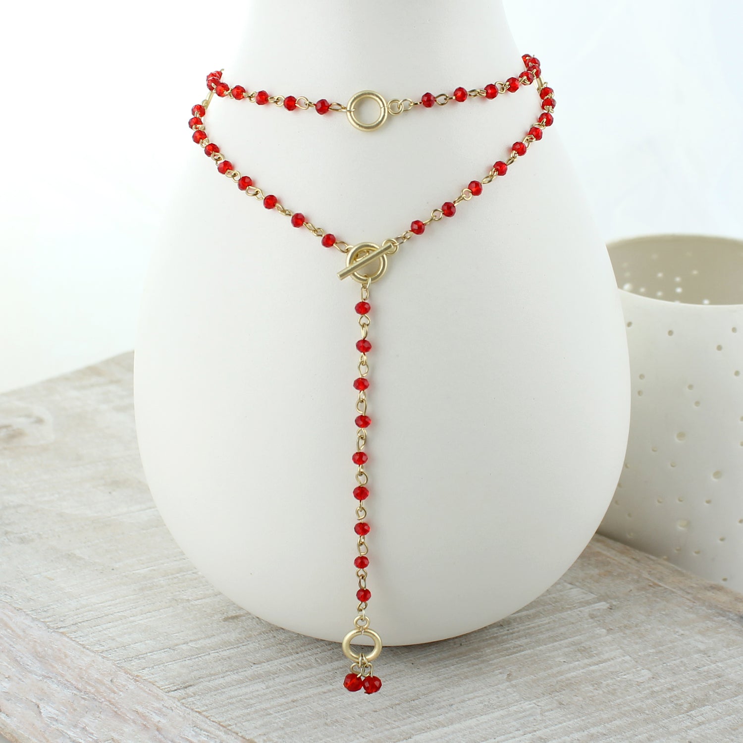 29” in length, this gold tone and red crystal bead strand features a toggle bar and eight circle loops, allowing it to be worn as a bracelet, standard necklace, lariat style necklace, or choker.