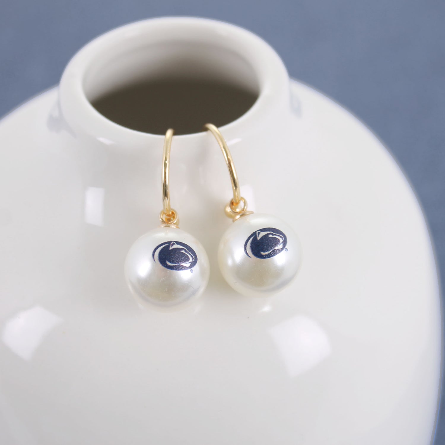 These elegant earrings feature oversized 14mm imitation pearls with Penn State logos on gold-tone open-back huggie hoops. Lightweight yet statement-worthy. Hoops measure ~ .5" in diameter. Designed to coordinate with our matching triple chain pearl pendant necklace.
